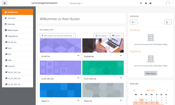 o Alles-in-einem-Kalender: Der Moodle-Kalender zeigt Ihnen alle Kurstermine, Gruppentermine und persönlichen Termine auf einen Blick.