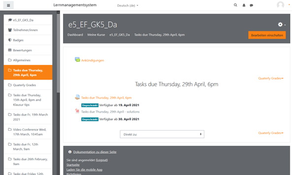 o Die Moodle App zeigt neue Inhalte für Schüler nicht immer zuverlässig und sofort an. Daher sollten Schüler sich immer per Browser einloggen, um alle Inhalte aktuell zu sehen.