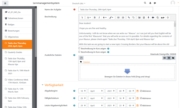 o Zugriffsbeschränkung: Inhalte können bereits angelegt, aber für Schüler nur zu einem bestimmten Datum und Uhrzeit sichtbar werden.